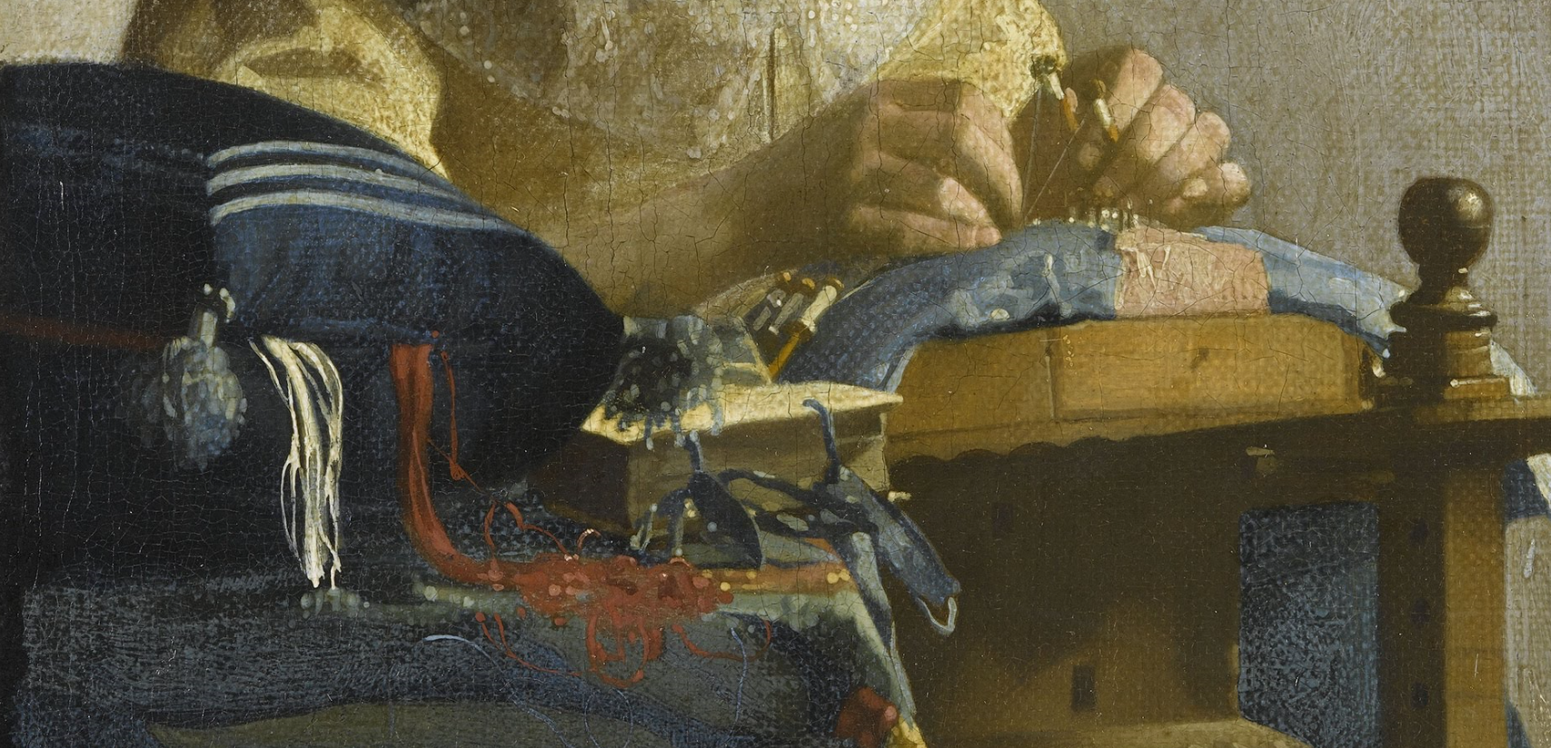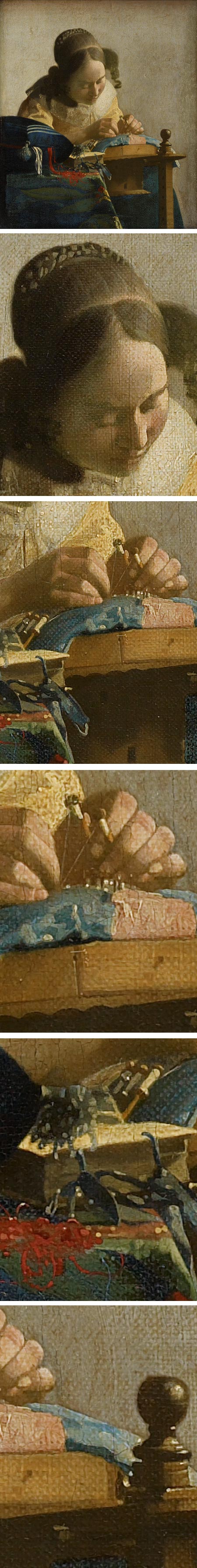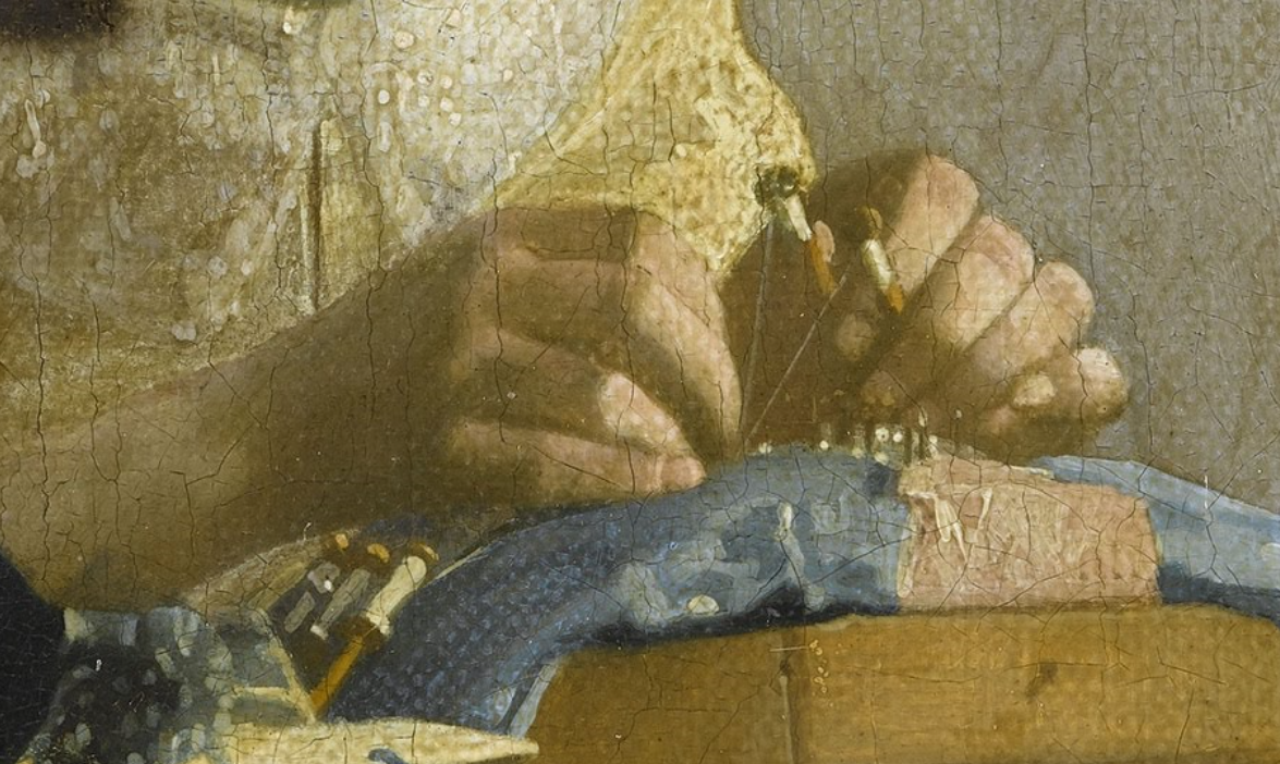 在这幅画中,女子的每根手指都在巧妙地穿针引线。她的左手拇指、食指和中指捏着两个线轴,将两根线收紧。她的手腕外侧搭在工作台上,作为支撑。最巧妙的是她的左手小拇指微微抬起,调节着织线的张力。