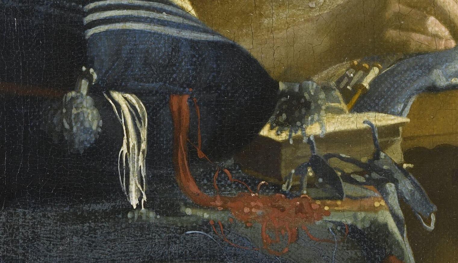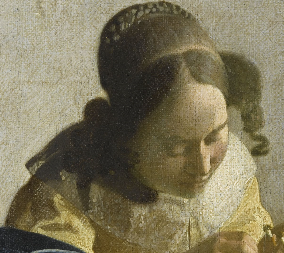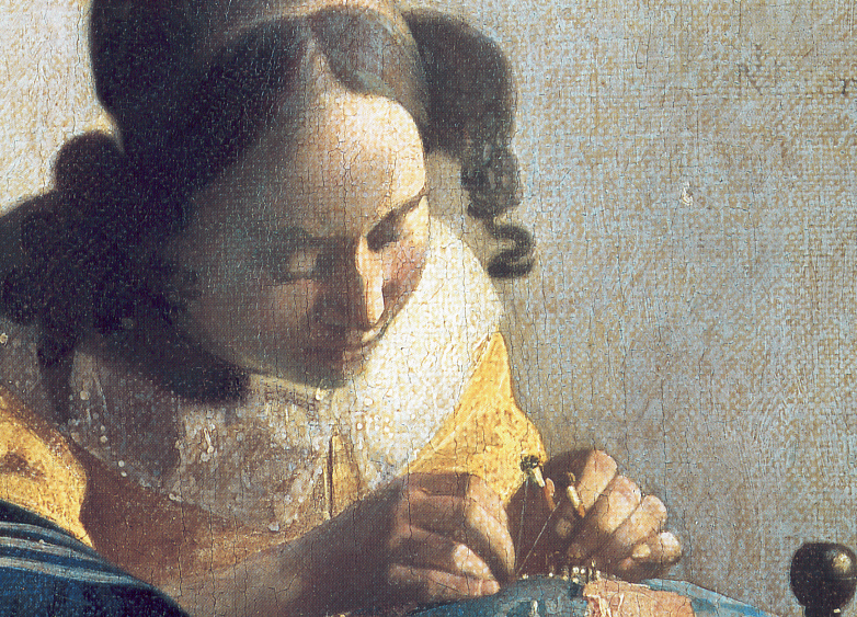 女子的工作台是制作梭织花边的专用桌子。铺在桌上的毛毯在维米尔的作品中常常出现,毛毯颜色通常较深,图案通常比较模糊。