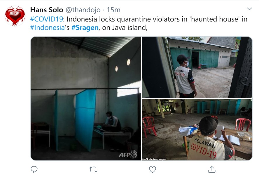 为了让人们能安心待在家中,印尼的各地政府使出了各式极具创意的手段。位于中爪哇的斯拉根地方政府,在中央政府发表声明之后,就宣布要改造辖区内被废弃的房屋,尤其是那些最恐怖阴森、据传有鬼怪出没的,然后在里面配置上床位,专门用以安置违抗总统命令返回斯拉根并拒绝隔离的人。目前已经有5位居民被关了进去,度过剩余的隔离观察期。