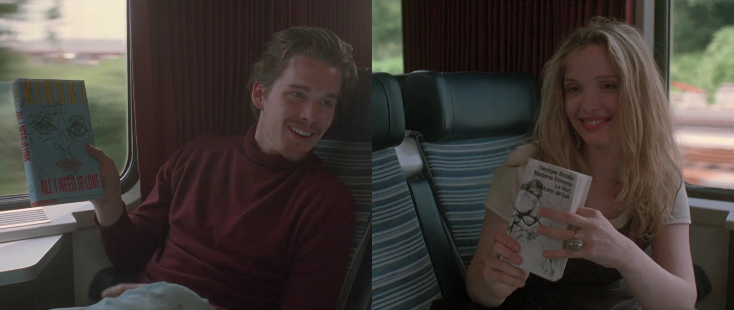 《爱在黎明破晓前》中,陌生男女通过阅读打开话题。