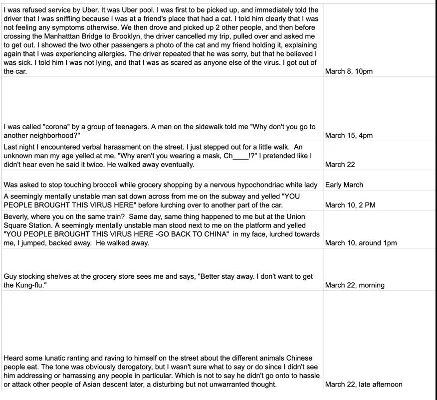 在这份共享文档中,许多人在分享自己的遭遇。一位名叫Ida Chen的女性说,她在东村步行时,一名骑自行车的男子对她说,“嘿李女士(她并不姓李),如果你没携带病毒的话,我真想x你。”此人尾随了她三条街区,直到报警后才离去。还有一位女士报告说,在与丈夫坐在布鲁克林造船厂时,一位女性对她谩骂“中国臭xx”和“Ching chong”。不少人碰到路人对自己大喊“回到中国去”。