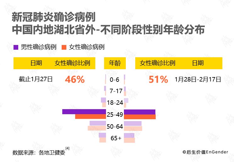 美国东北大学传染病研究中心收集整理了截止2月17日,中国除湖北外各省份卫生健康委员会(卫健委)等官方渠道公布的病例个案详情数据,共计8579确诊病例。从第一阶段到第二阶段,女性确诊病例由46%上升至51%,且主要变化的年龄分布在25-49岁之间[4]。也就是说,在疫情的集中爆发期到来时,中年女性的确诊病例占比大幅提升,而她们在家庭中,扮演的是妻子、女儿、儿媳、母亲的角色,既要照顾老人,也要照顾儿女,还要照顾丈夫。