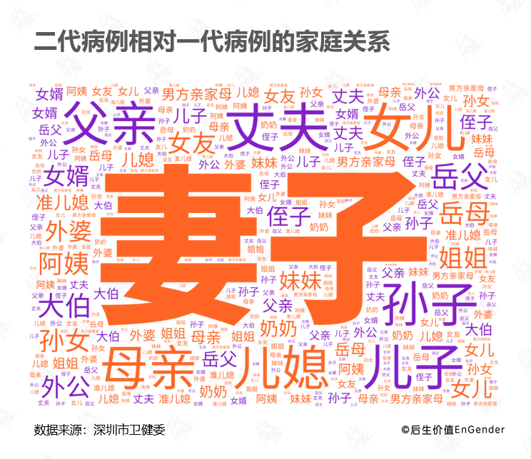 结合家庭聚集性病例中,二代病例的家庭关系词云统计图,“妻子”是被感染最严重的家庭成员,我们不禁推测出一个非生物学的潜在因素:居家隔离中,女性扮演的护理角色让她们更易感。