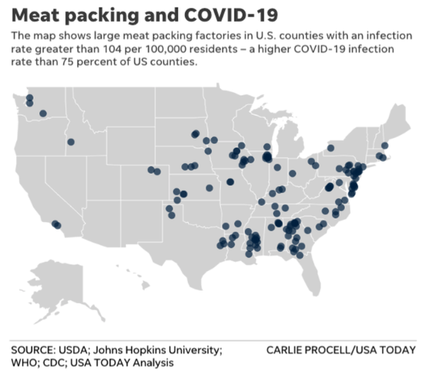 类似这种肉类加工厂关闭不是个案。媒体统计显示,美国150个最大的肉类加工厂所在地均处于新冠疫情爆发的县市。