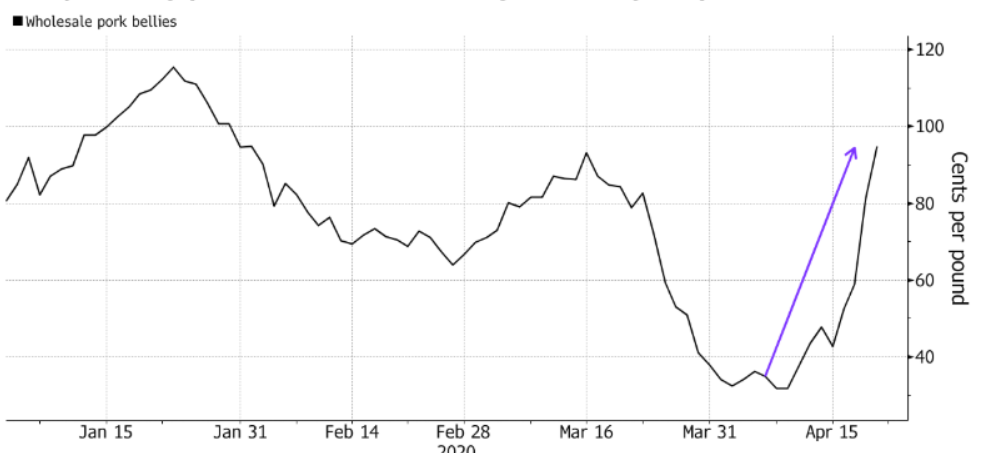 美国猪肉市场正在上演冰火两重天:在农户端,由于屠宰场关闭,生猪供应过剩价格跳水;而在超市端,由于屠宰场供应短缺,鲜猪肉价格直接飙涨。
