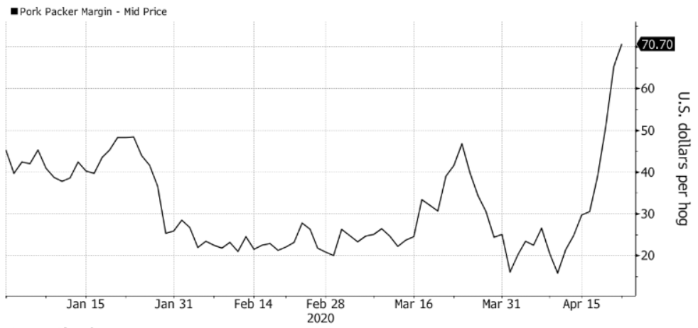 这种生猪——猪肉价格差使得仍然能够运转的肉类加工厂赚的盆满钵满。一些工厂正在农户从购买低廉的生猪,加工转手卖给超市,赚取高额的溢价。自4月1日以来,猪肉利润率已跃升340%。