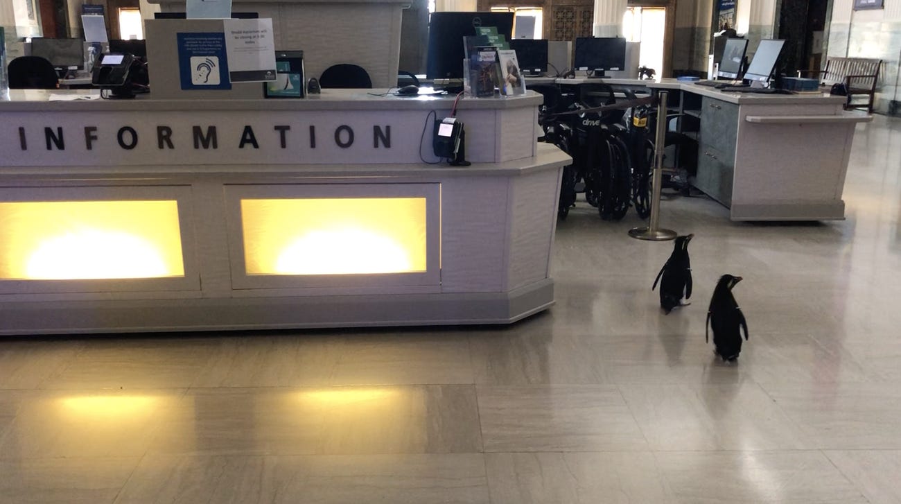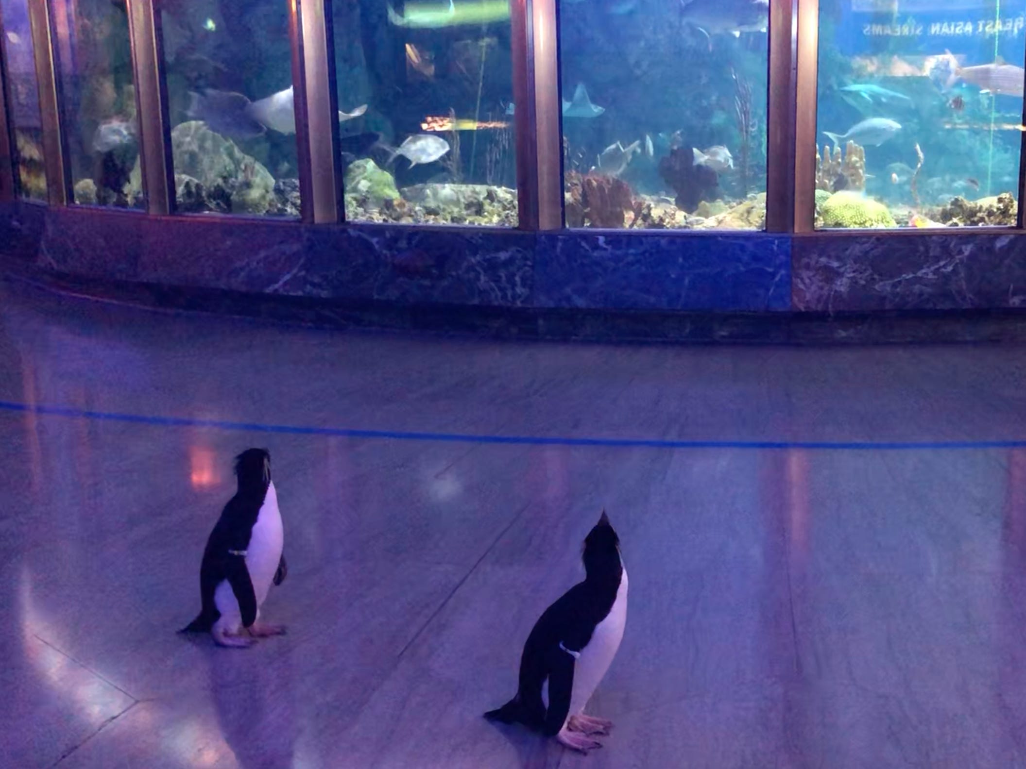 爱德华(Edwaed)和安妮(Annie)是一对企鹅情侣,它俩结伴参观了水族馆的圆形大厅,连前台都不放过。