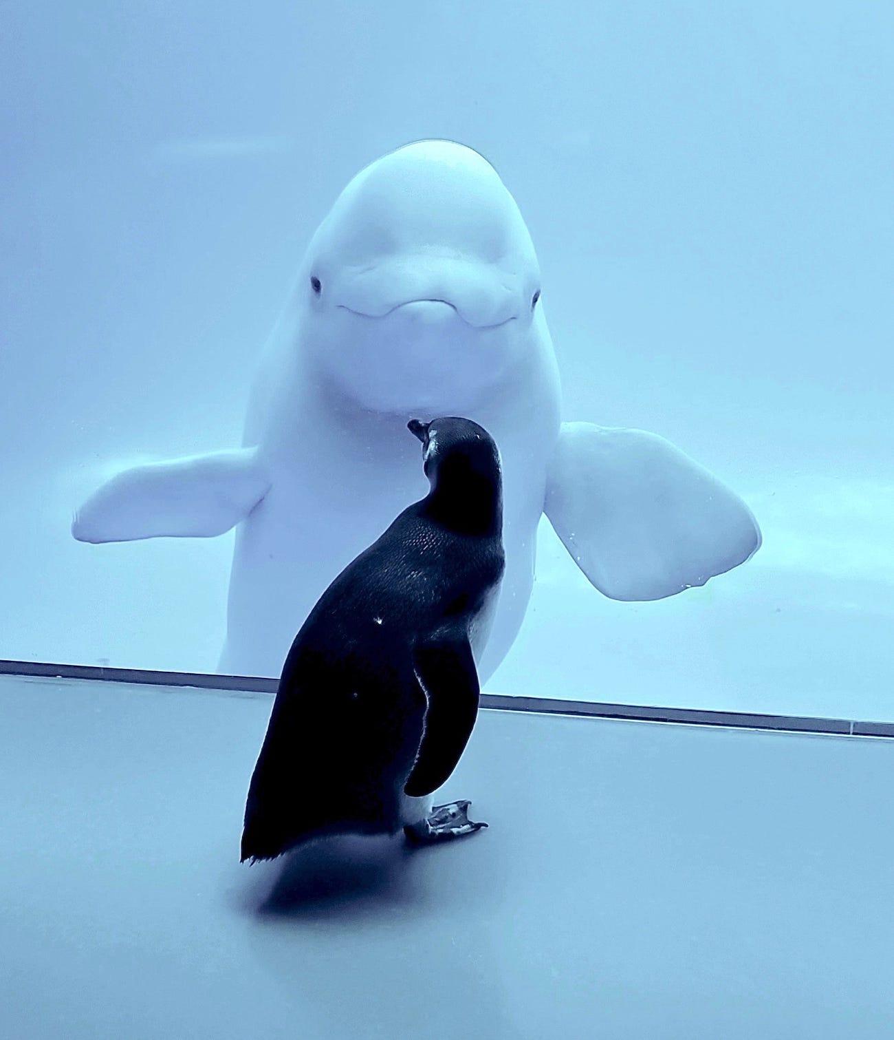 这恐怕是白鲸第一次见到企鹅——毕竟前者生活在北半球的北冰洋,而企鹅原产于南半球。