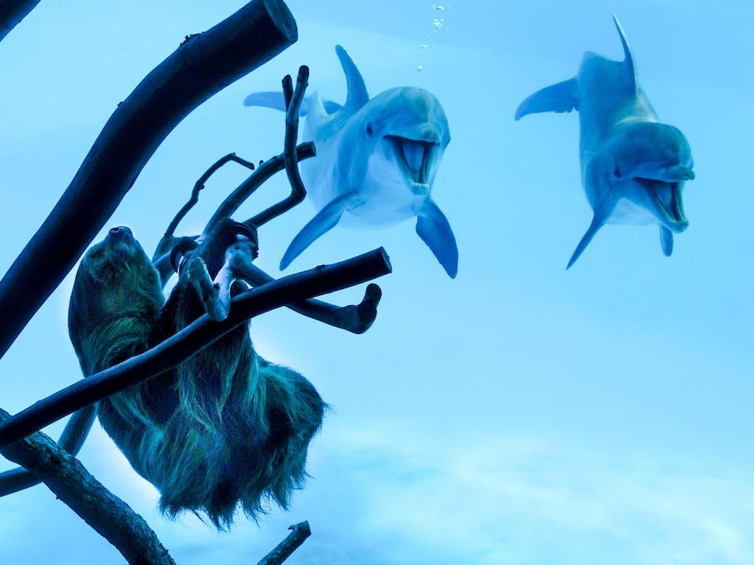 德克萨斯州立水族馆则把树懒奇科(Chico)带到了海豚区。