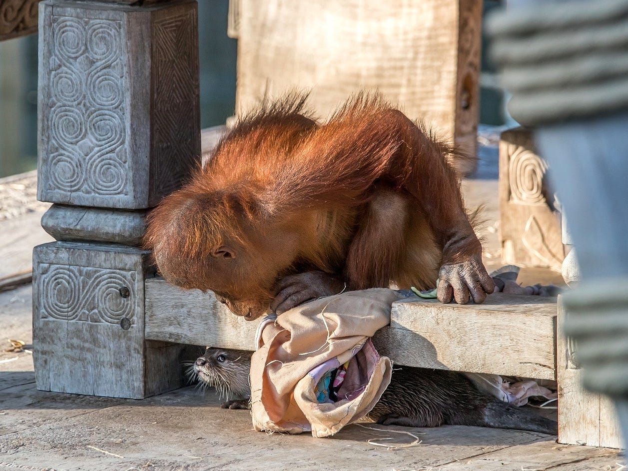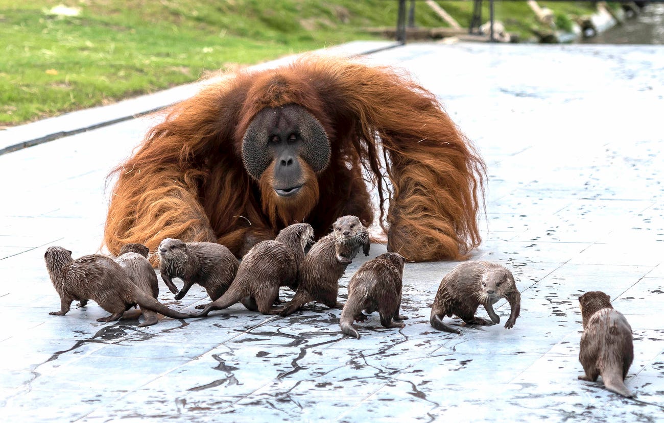 “当你把红毛猩猩和水獭放在一起,你会得到什么?对,是完美的邻居。”这家动物园的工作人员说。在这家动物园,亚洲水獭赖以生存的河流刚好流经红毛猩猩的领地。24岁的猩猩父亲维扬(Uijan)、15岁的猩猩母亲莎莉(Sari)和它们4岁的儿子贝拉尼(Berani)自2017年起,就生活在这里。