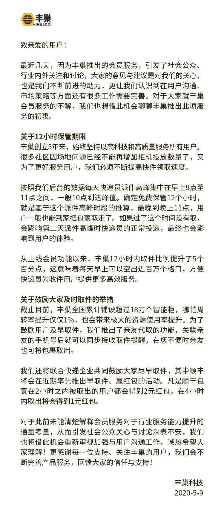 5月10日凌晨一点,丰巢发布了《致亲爱的用户一封信》,公开信中再度回应,深表不安的同时,解释初衷并推出鼓励尽早取件的红包政策。