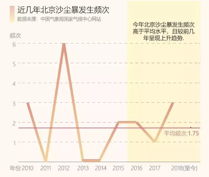 经过了 50 年的治沙运动,近年来我国的沙尘天气已经明显减少,沙尘暴也变得“温柔”了许多。但是作为气候现象,沙尘天气在短期内也不会消失,每年将会定期光顾。据 2018 年中国气象局国家气候中心网站的数据显示,近年来北京沙尘暴发生频次反而呈递增趋势。