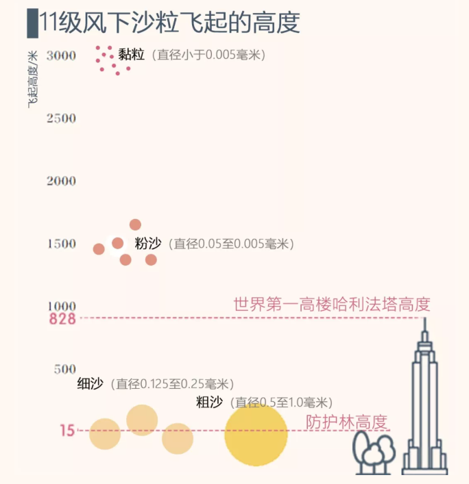 近几十年来,中国沙尘暴现象有了一定程度地改善。但是在强风面前,防护林也无法阻止沙尘暴形成。冷空气和大风影响范围垂直方向在 1500 米以上,大风天气里,二三十米高的防护林可以阻挡住部分粗沙和细沙,却无法阻挡被大风和寒潮带到高空中的粉砂和黏粒。