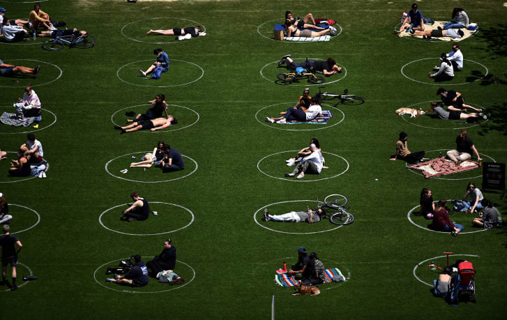 疫情时期,重新定义“画地为牢”。近日,纽约布鲁克林的多米诺公园供行人晒日光浴的草坪上,出现了大小一致、排列整齐的白色圆圈。圈子与圈子之间相隔六英尺(约 1.5 米)距离,人们在草坪上放松时要呆在圈子里,与其他人保持社交距离。