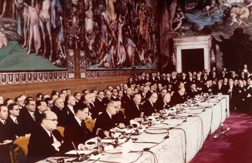 1958年1月1日,法国、意大利、荷兰、比利时、卢森堡和西德六国首脑和外长在罗马签署的两个条约,即《欧洲经济共同体条约》、《欧洲原子能联营条约》(统称为《罗马条约》),经过六国先后批准,正式生效,欧洲经济共同体成立。