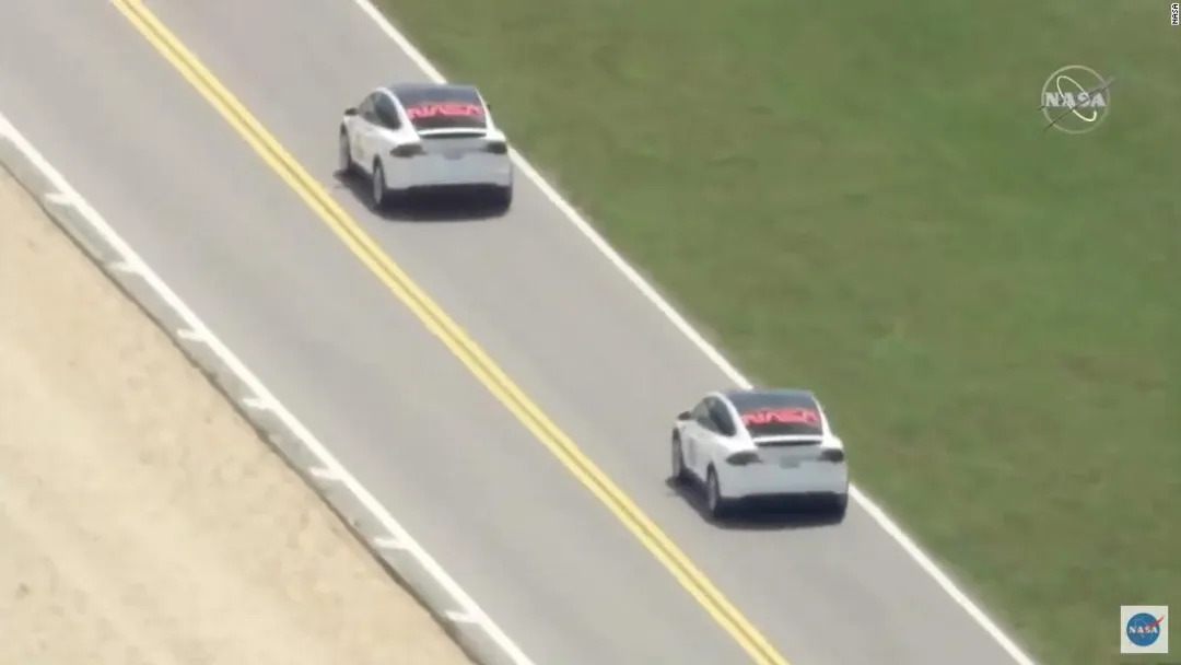 送两位宇航员前往现场的是贴着NASA标志的白色特斯拉Model X。