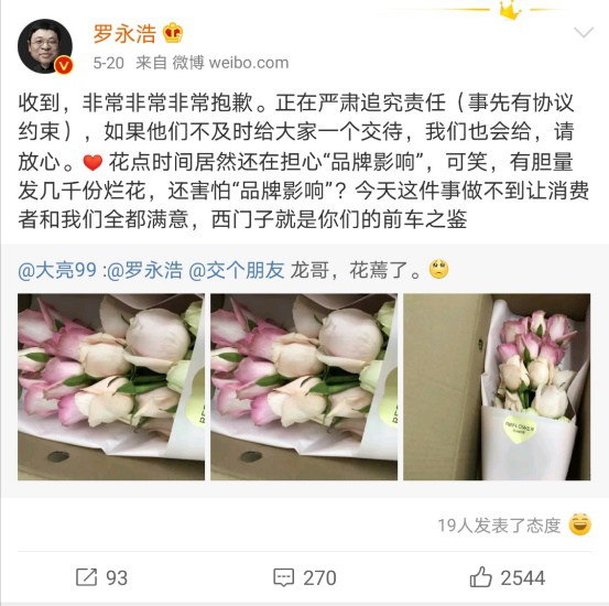 5月20日,在这个本该充满浓情蜜意的日子里,加入直播电商行业不久的老罗又在微博道歉了,这次他赔了差不多100万。而起因就是因为通过他直播间售出的鲜花出现了大面积的质量问题。
