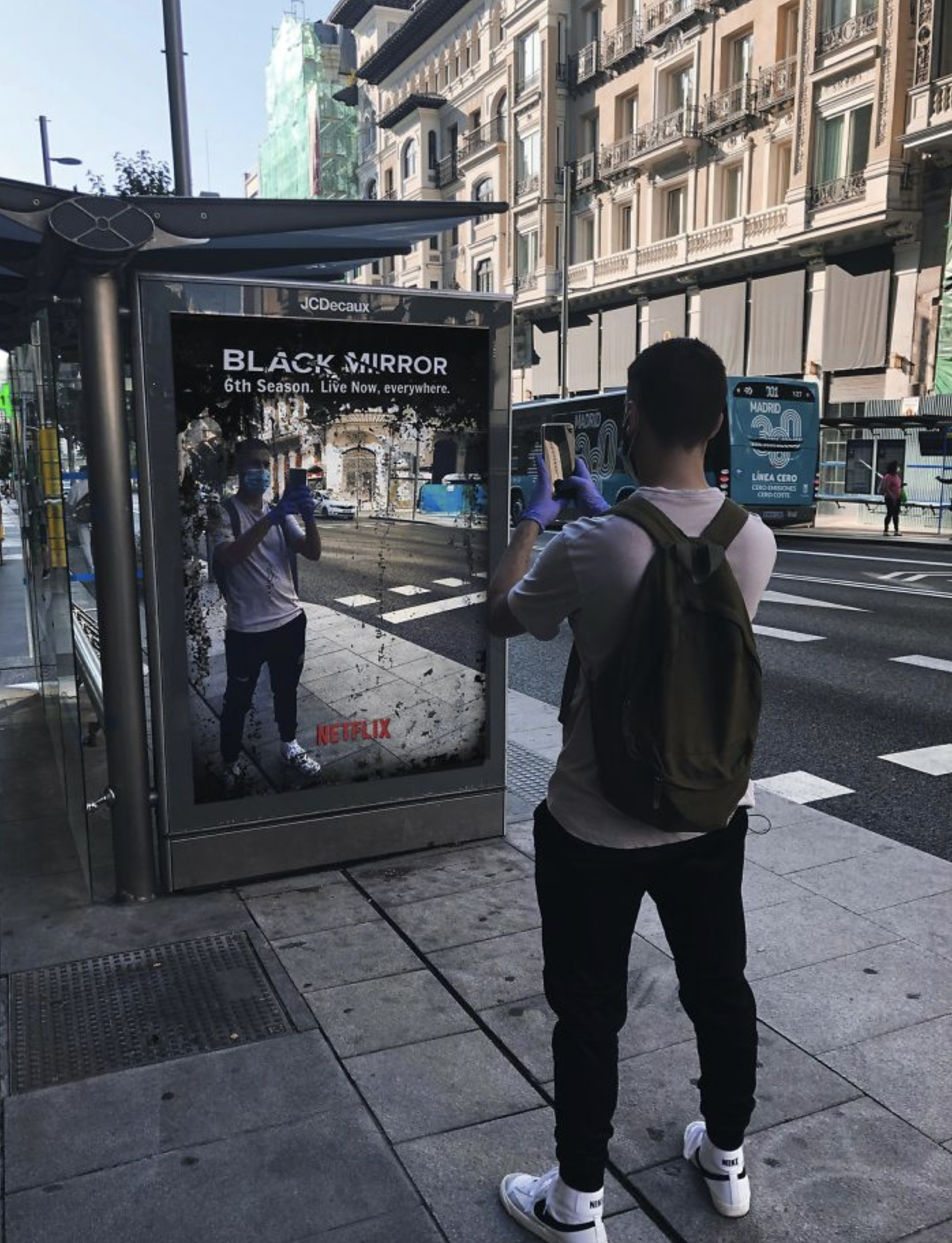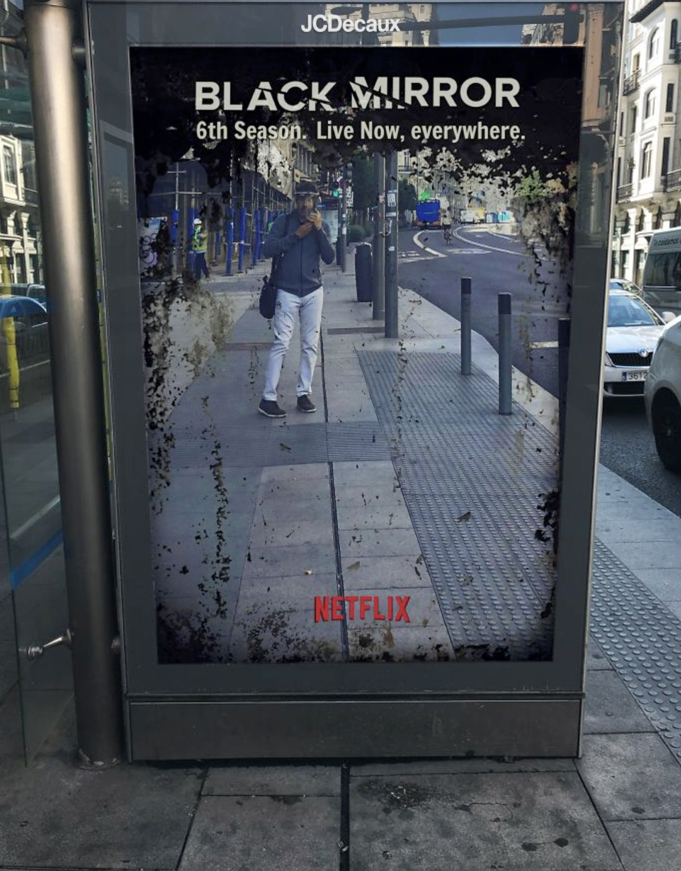 果然,随后就有网友在公交车站见到了这面非官方的“黑镜”广告牌。广告牌让人们可以拍下一张身处“黑镜”中的照片,化身《黑镜》第六季的主人公。