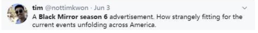 这幅广告也引发了不少网友的共鸣:“这个《黑镜》第六季的广告,用来映射当前席卷全美的事件简直不可思议地适合。”