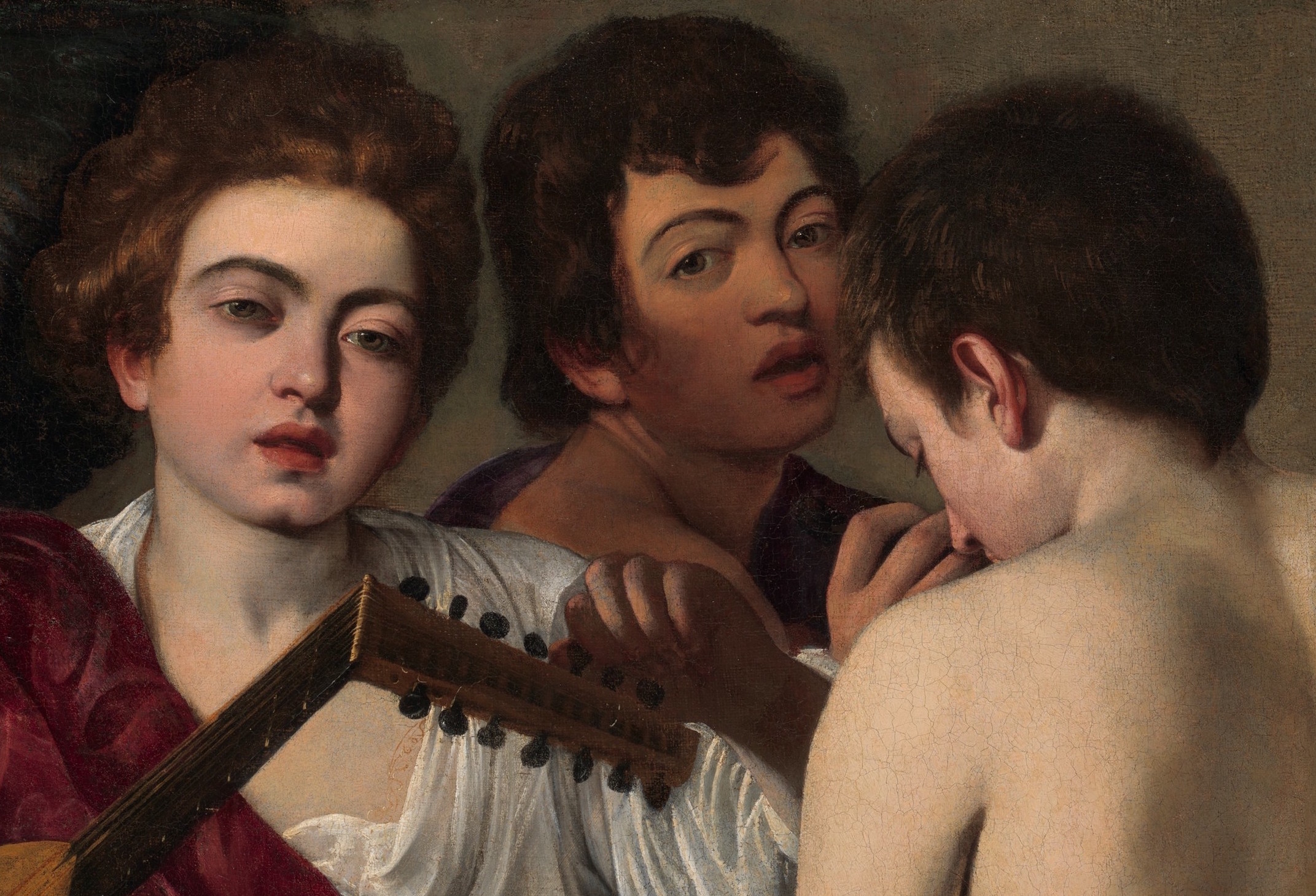 值得关注的是,两幅关于音乐题材的画作,都带有着模糊的性暗示。如《弹鲁特琴的男孩》中的乐谱,《音乐家们》左侧那个手拿葡萄、有着丘比特翅膀的男孩,撩拨情欲的鲁特琴,这些极具争议的符号,都引发了多种解读,包括对卡拉瓦乔的同性倾向的怀疑。