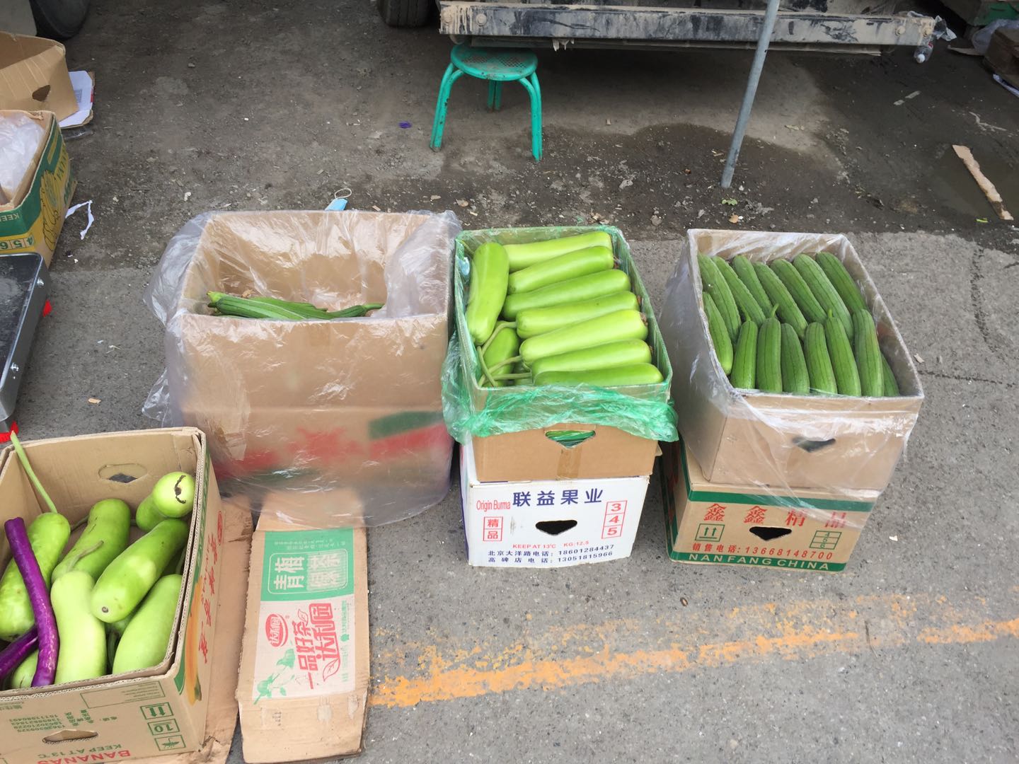 若以净菜 1.0 的标准而言,新发地销售的蔬菜绝大部分都已经满足了这个标准。茭白、黄瓜、丝瓜、西葫芦等蔬菜,都已经经过初步的筛选,被封装进纸箱当中。销售时,商户只需要打开一个纸箱作为展示。