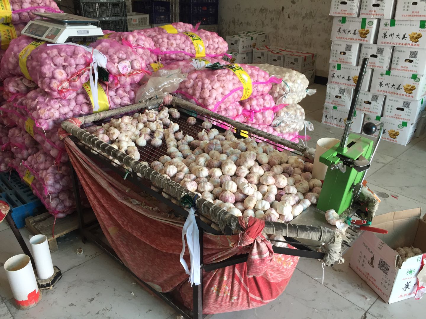 仅有少部分蔬菜需要在市场内做进一步加工。孙先生雇佣了两名帮工,他们将从山东运来的大蒜搬出来,去除外层的表皮,然后分装进网袋当中。孙先生认为,这只是一种粗加工,却也符合童伟给出的净菜 1.0 标准。孙先生说,四五年前他就已经开始这么做了。当时新发地市场要求商户减少垃圾,因此许多原本在市场内进行的粗加工都转移到了其他地方。而他所销售的大蒜,在进京之前,已经在山东的蔬菜加工厂进行了一些简单的加工。
