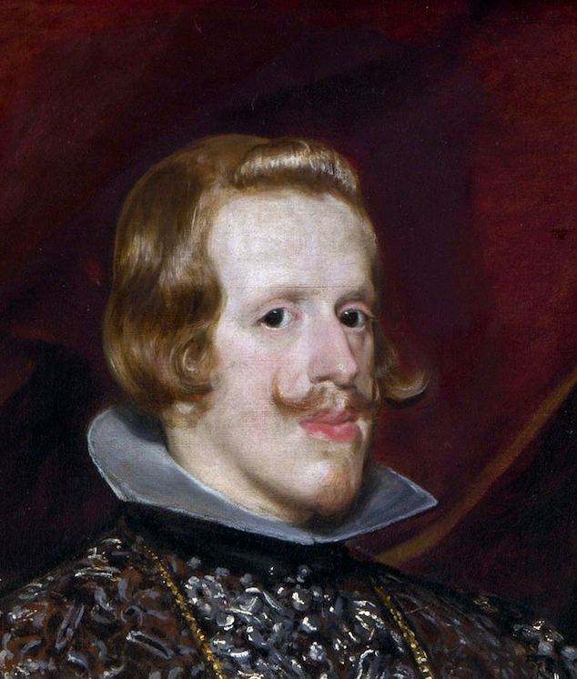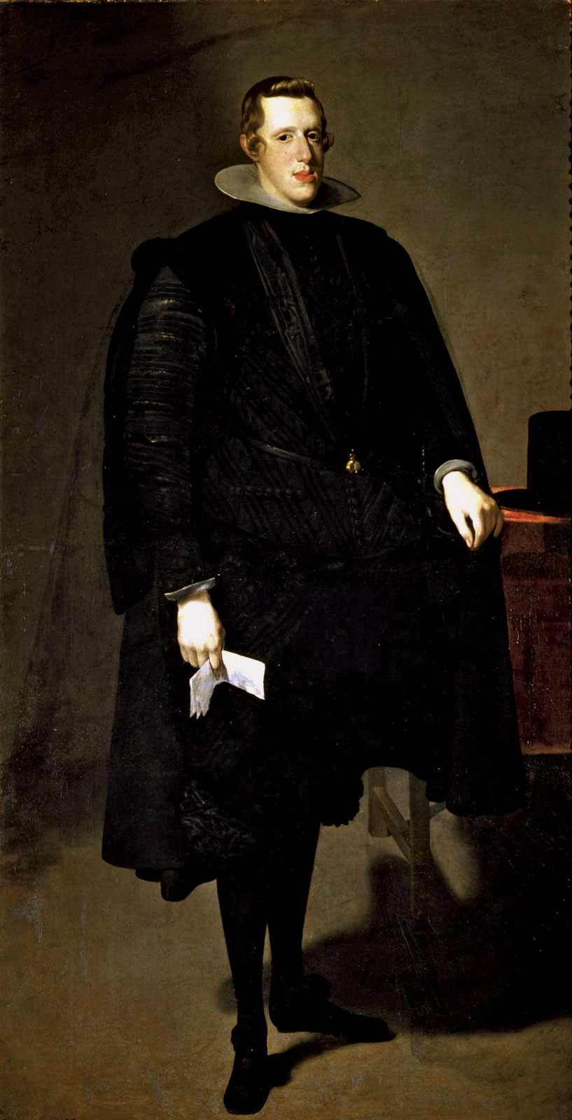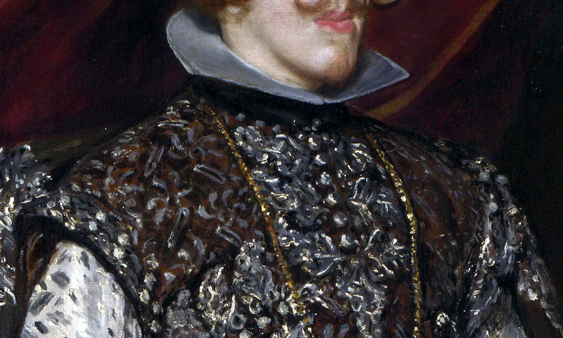 画中的菲利普四世,正在参加一个重要的会议,穿上了和日常朴素黑色服装不同的华丽服装:由紫棕色织物制成的无袖上衣和马裤,绣着银色贴花,加以纽扣用作装饰,披着的斗篷上缝着银色的修边,内衬着银白色丝绸内衣。
