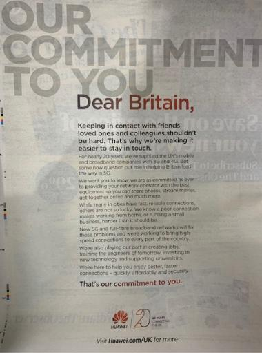 为了打消英国官方和民众的顾虑,华为近期高价在英国多家大型报刊——包括《卫报》、《每日电讯报》、《泰晤士报》等国家级报纸上刊登广告,以回应人们对华为在英国5G建设过程中的担忧。