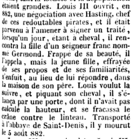 Louis III ouvrit,en 882,une négociation avec Hasting,chef de ces redoutables pirates,et il était parvenu à l'amener à signer un traité,lorsqu'un jour,étant à cheval,il rencontra la fille d'un seigneur franc nommé Germond.Frappé de sa beauté,il l'appela,mais la jeune fille,effrayée de ses propos et de ses familiarités,s'enfuit,au lieu de lui repondre,dans la maison de son père.Louis voulut la suivre,et piquant son cheval,il s'élanca par une porte,dont il n'avait pas calculé la hauteur,et se fracassa le crane contre le linteau. Transporté à l'abbaye de Saint-Denis,il y mourut le 5 aout 882.