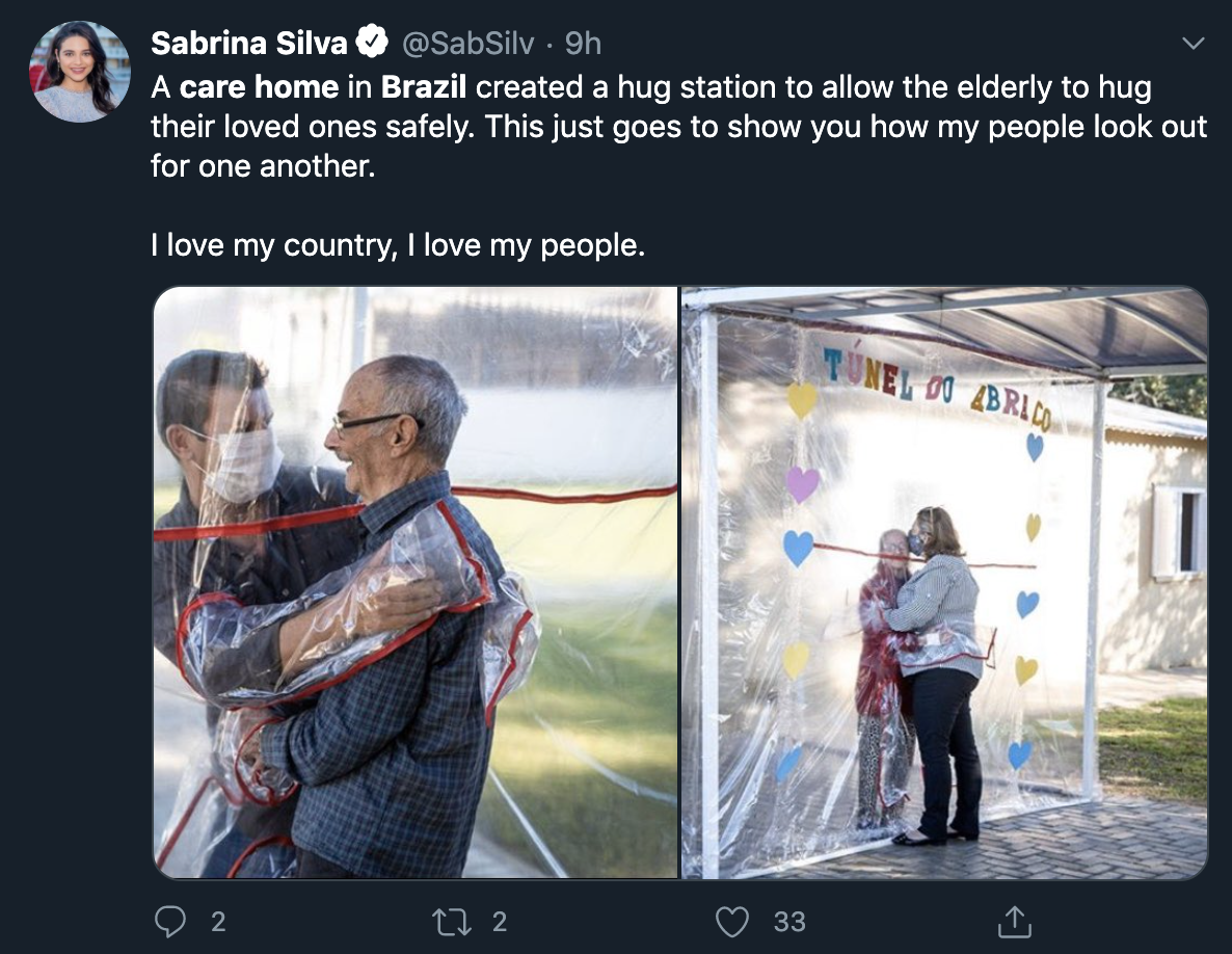 作为受此次疫情影响最深的国家之一,截止 6 月 21 日,巴西新冠肺炎死亡人数已经超过 5 万人。一系列的防疫措施,让许多人不得不体验长时间的隔绝,心理学专家鼓励人们在防疫的同时,不要忽视自身的情感需求,要通过不同的方式来弥补和重建亲密关系。