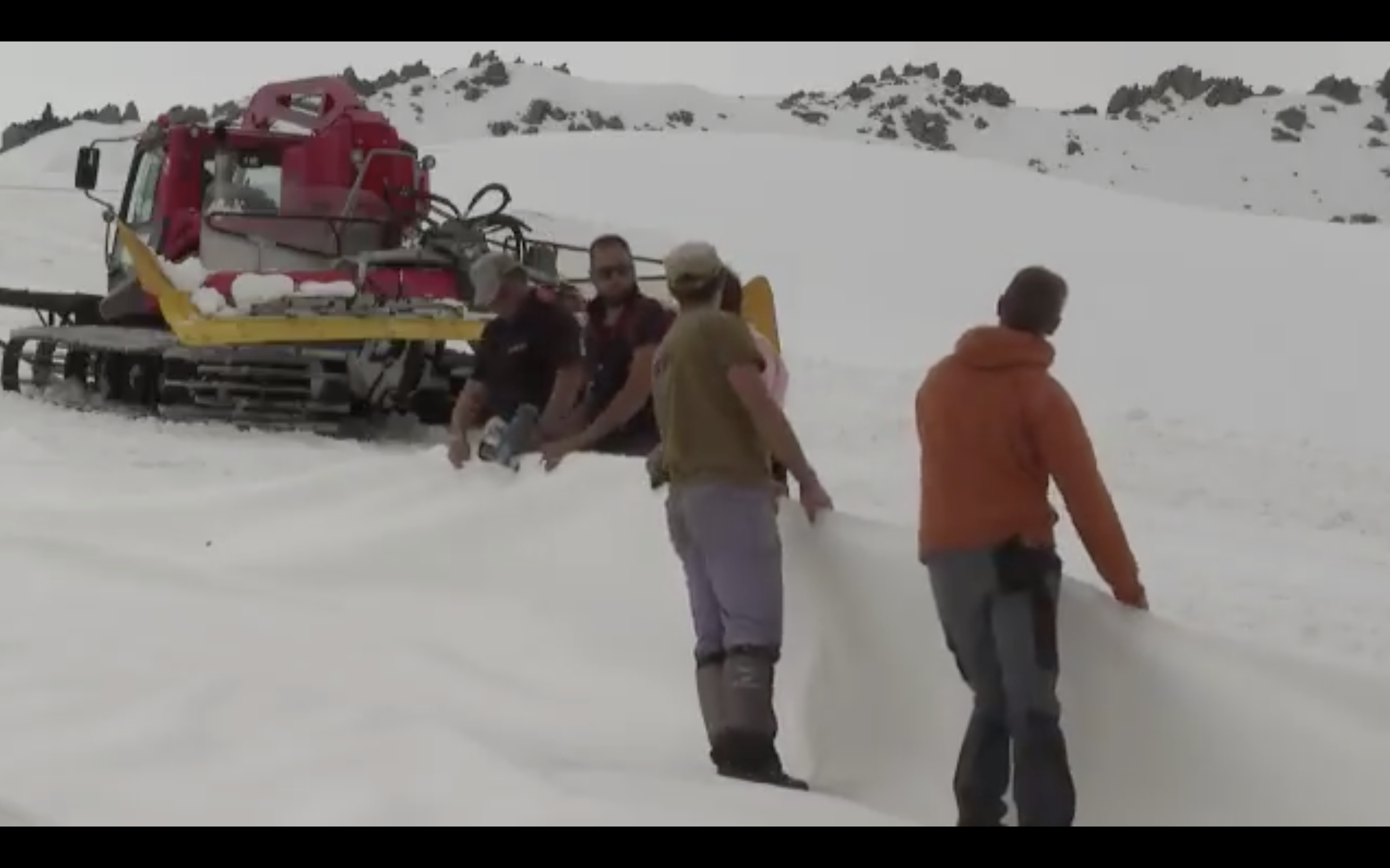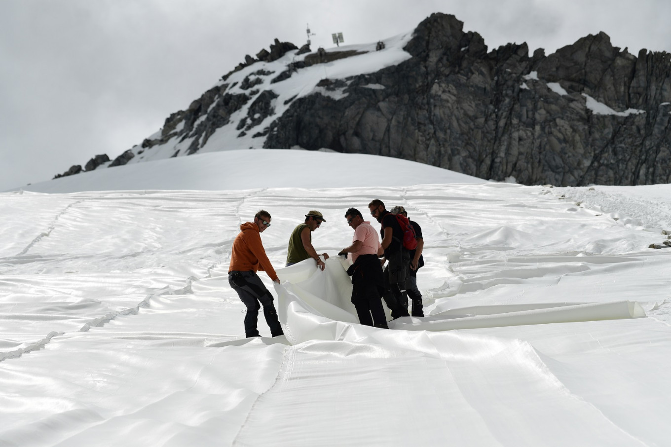 每当滑雪季节结束,缆车停运,夏天的阳光照射到阿尔卑斯山的冰川上,一个来自意大利的团队就要开始行动。在闪闪发光的雪地上,他们铺开一块巨大的白色防水帆布。