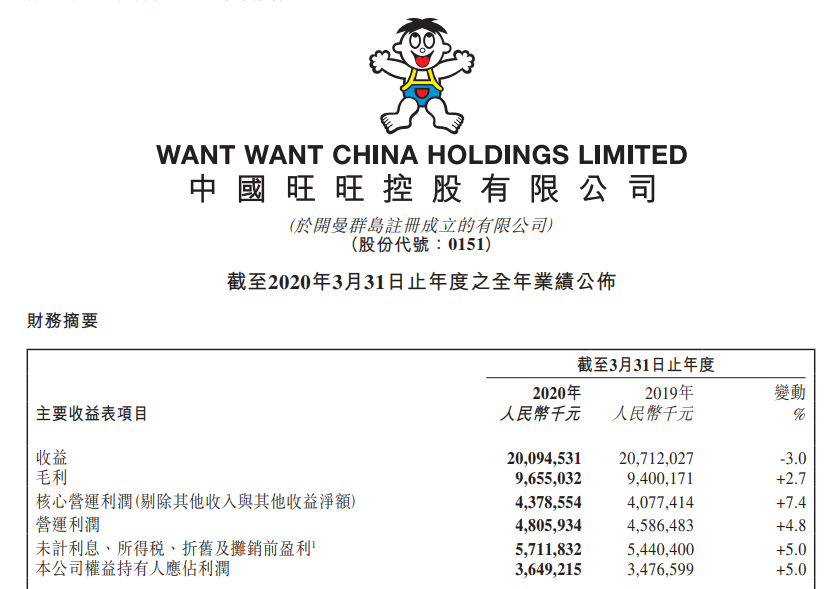 6月16日旺旺发布的2019年财报显示,旺旺营收下滑3%主要受到2019财年四季度(2020年1-3月)公共卫生事件影响。尤其是2020年2至3月期间,因疫情对整体供应链及销售等环节的不利影响,集团销售受到较大冲击。(注:旺旺董事会于2017年8月22日决议将2019年公司财政年度年结日由12月31日更改为3月31日。)