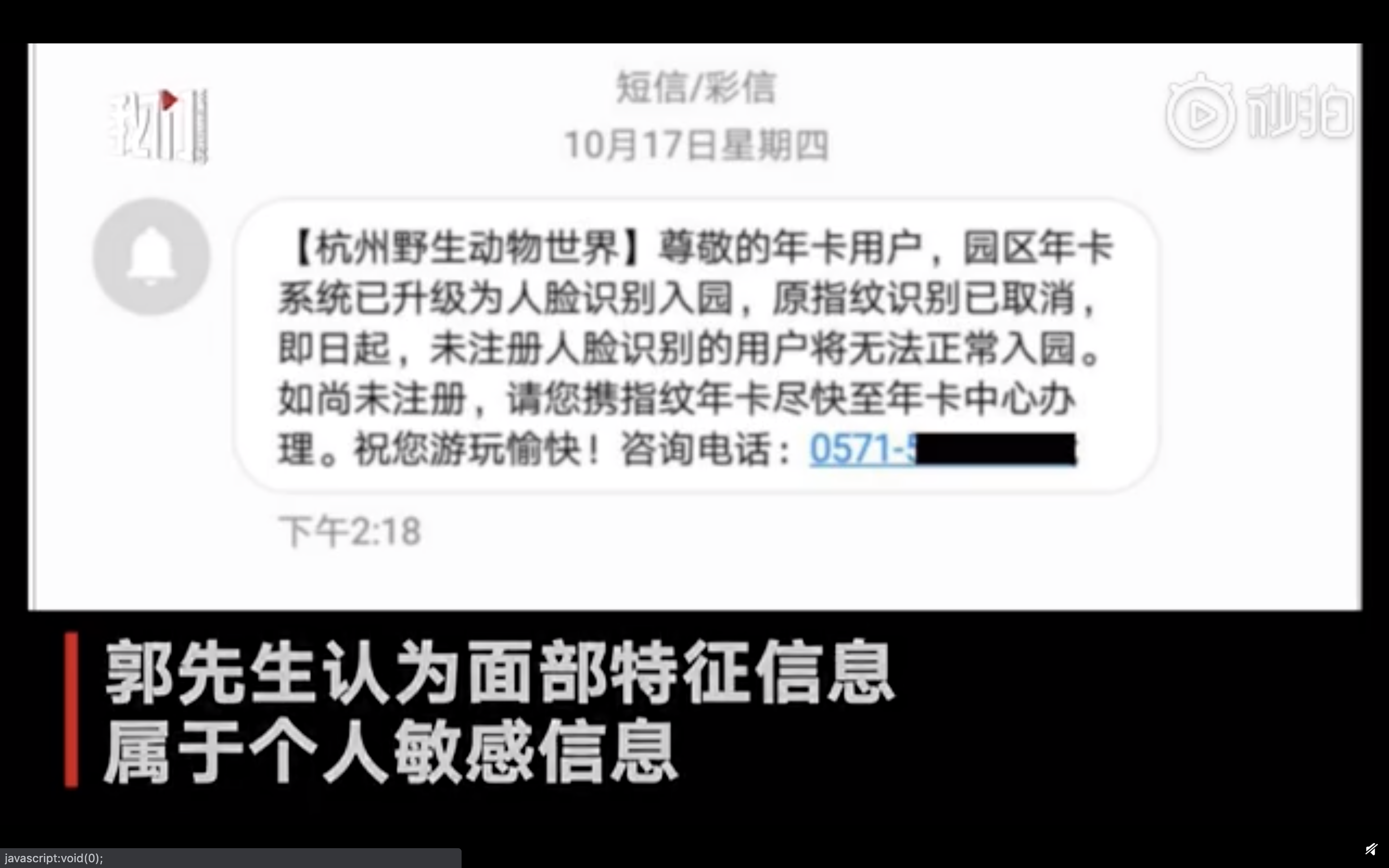 被告是杭州野生动物世界。去年 7 月,这家 AAAA 级景区开始对年卡用户的入园方式进行更新,从以往的指纹识别变更为人脸识别,并发短信告知用户,旧版的方式将取消,必须到园区处录入脸部信息。