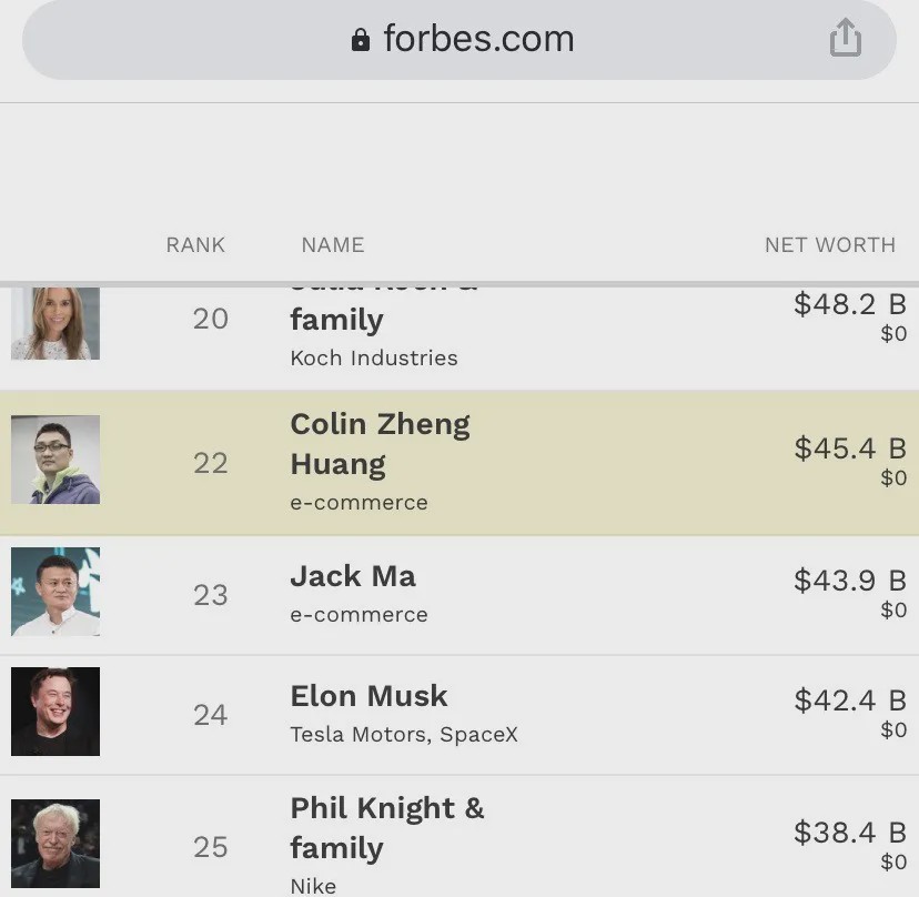 6月底,拼多多的市值突破千亿,超过京东。黄铮的个人身价也暴涨至454亿美元(约合3212.8亿元人民币)。在福布斯排行榜上,黄铮超越马云成为中国第二大富豪,与马化腾相差61亿美元,如果拼多多的市值超过1200亿美元,黄铮甚至会超过马化腾成为首富。这一度引发了公众的热议。