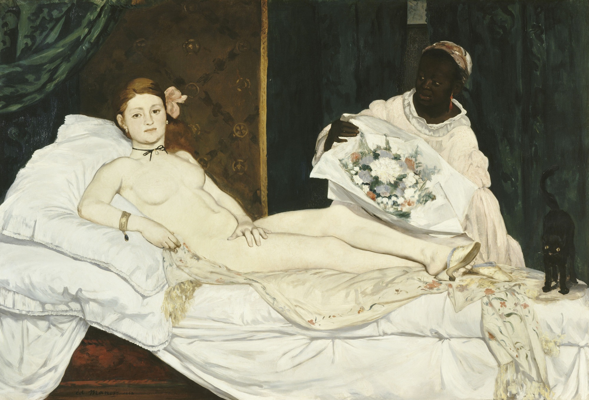 “奥林匹亚”其实是拿破仑三世时期,一个名声很差的交际花的绰号,这幅画似乎暗示着暧昧的交易,用的却是提香名画《乌尔比诺的维纳斯》的构图。