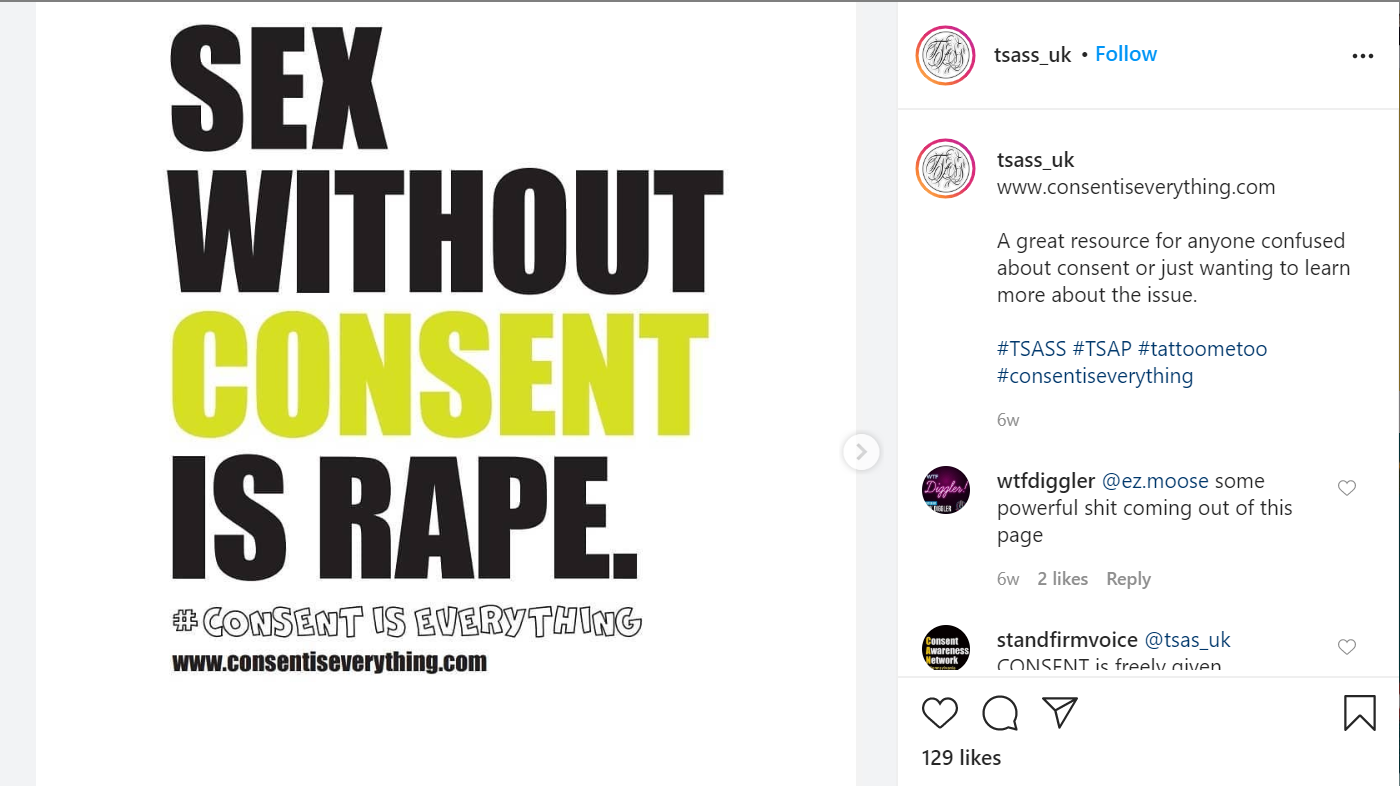 今年2月,28岁的纹身师Lucy Pigeo成立了TSASS。最初它是一个Facebook群组,3月又成立了Instagram页面,旨在解决行业内的性别歧视,帮助受害者,并分享相关资源。Lucy想让 TSASS成为一个安全的空间,让人们可以说出他们的经历。