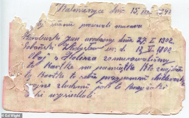 落款是两名波兰人, 39 岁的扬 · 卡拉莱夫斯基和 41 岁的瓦迪斯瓦夫 · 索班斯基,他们于 1941 年写下这个纸条。