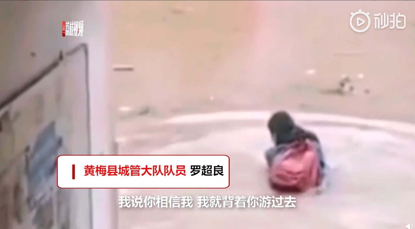 湖北省黄梅县,城管队员帮助一名赶考生淌过一米多深的积水处