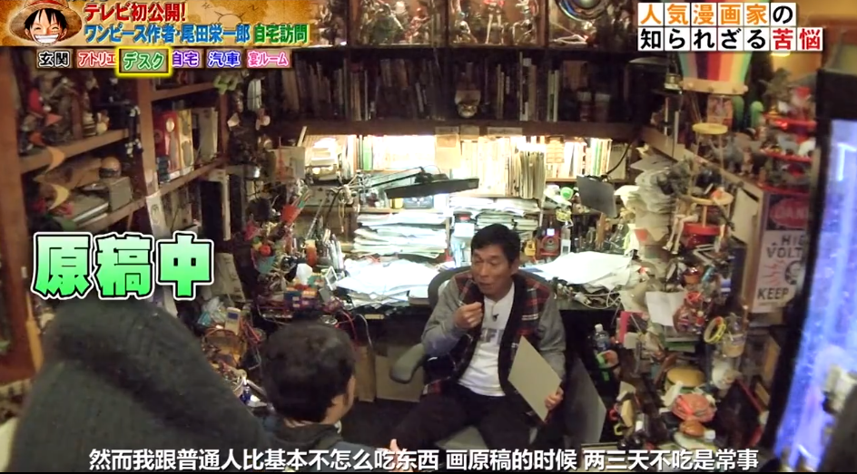 在这样高收入的背后,是尾田十年如一日的连载生活。在日本的一档电视节目中,尾田表示自己每天都只在早上9点到12点睡上三个小时左右。一周下来,他呆在工作室的时间长达132个小时,二十多年几乎无休,为了画原稿2、3天不吃饭都是常事。