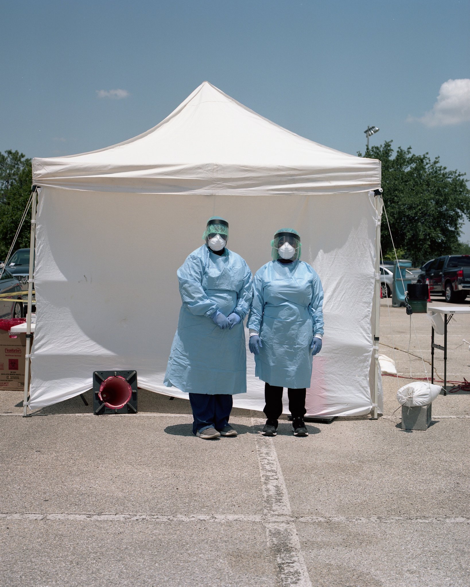 护士Modupe Allen(左)和Joyce Kadara,他们在休斯顿贝尔溪公园的停车区的检测大棚站岗,