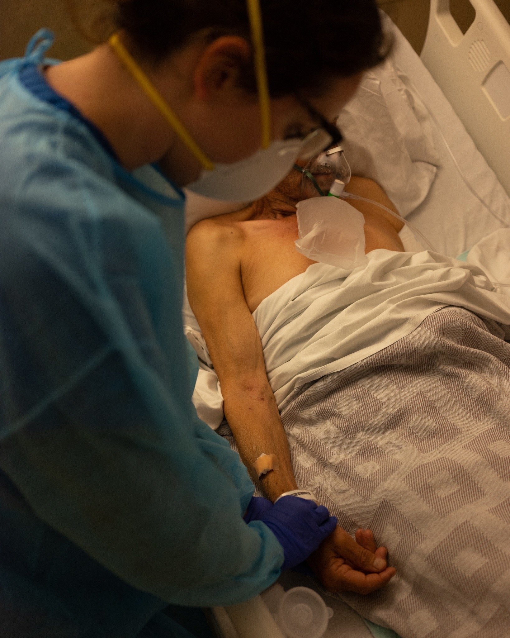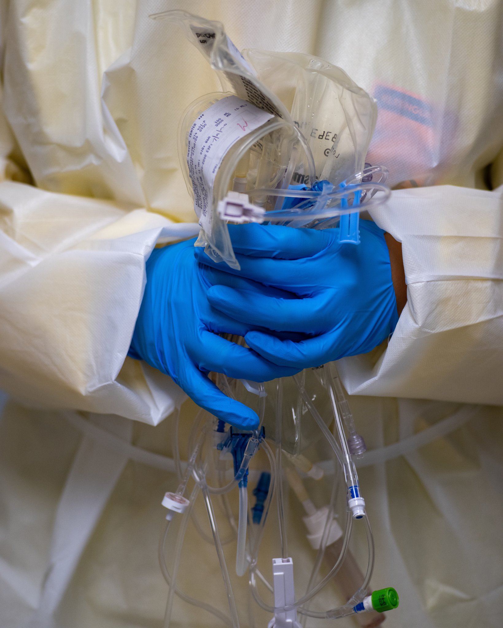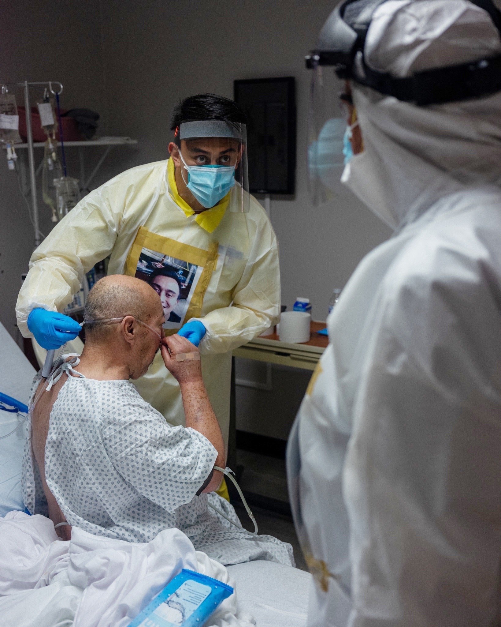 注册护士Deanna Sharp正在休斯敦圣约瑟夫医疗中心护理一名新冠肺炎患者。