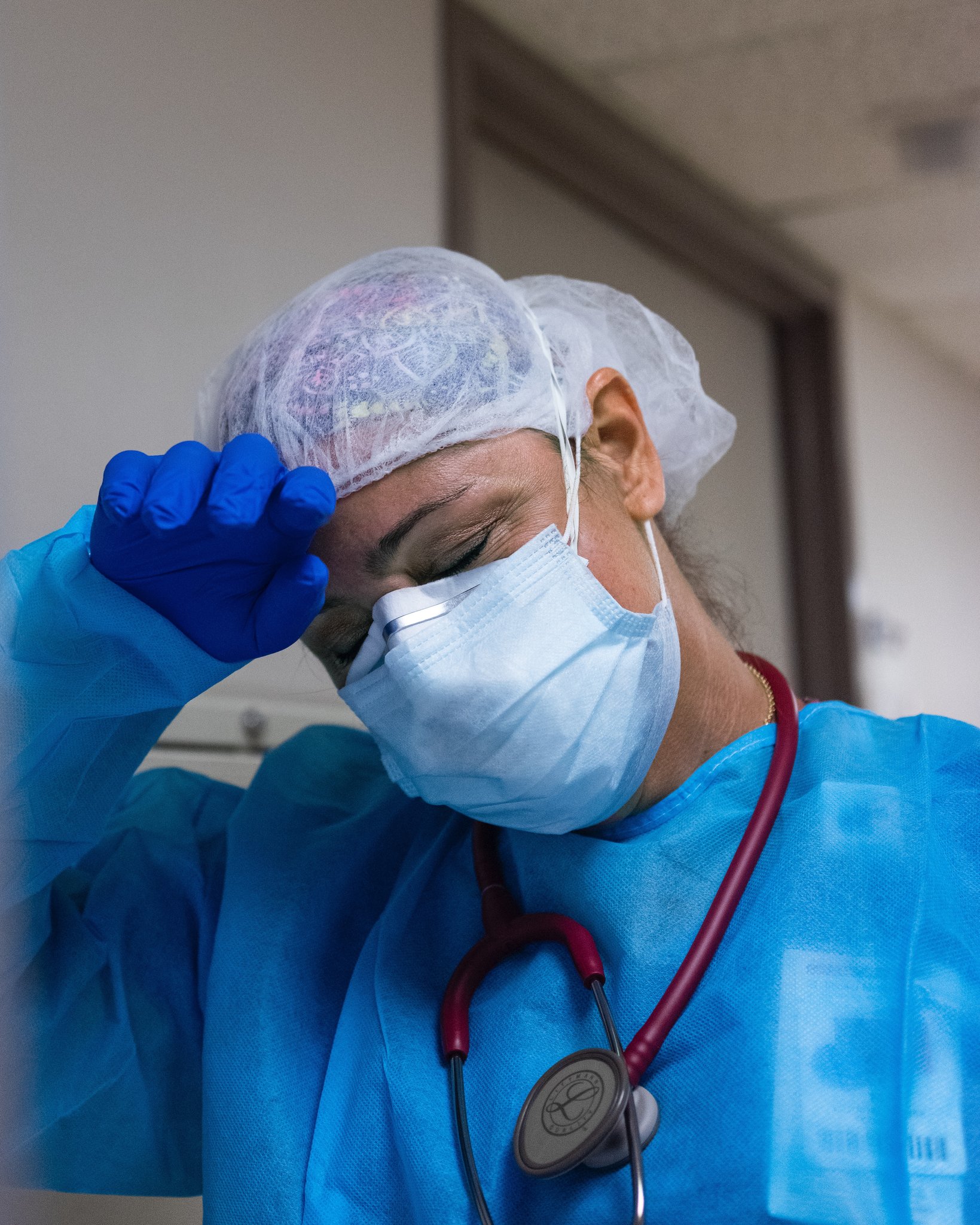 在休斯顿联合纪念医疗中心,重症监护室护士Depti Giga正在换防护服。
