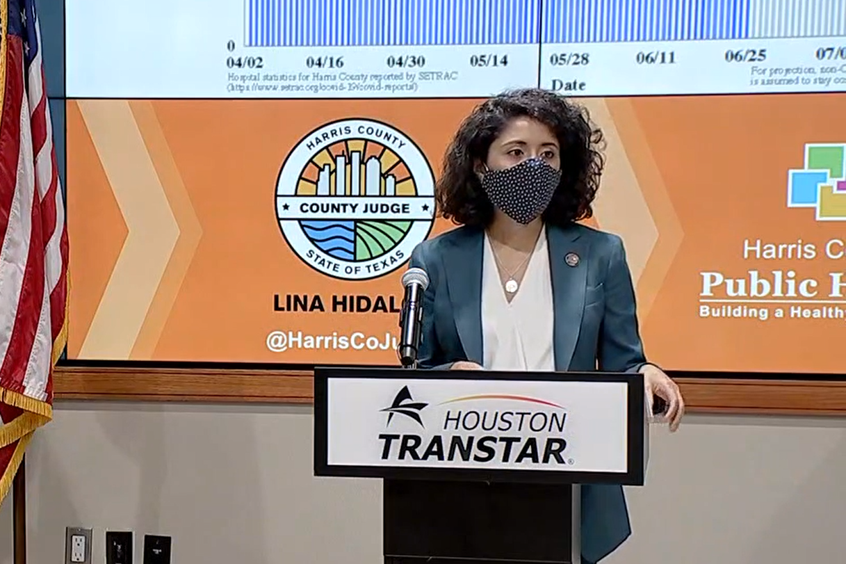 哈里斯县法官莉娜·伊达尔戈(Lina Hidalgo)正在新闻发布会上通报该县疫情情况。