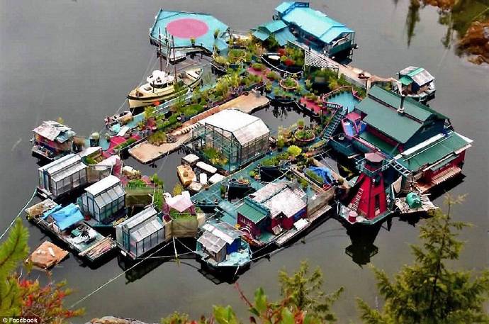 在加拿大不列颠哥伦比亚省托菲诺以北16公里处,温哥华岛西海岸外,凯瑟琳·金(Katherine King)和韦恩·亚当斯(Wayne Adams)生活在一个可以一直漂浮的院子里。这里被称为 “自由湾”,是他们的心爱之作,全部使用回收和打捞的材料手工建造。在过去的29年里,这里一直是他们的家。到达这里的唯一选择是通过船,“自由湾”距离最近的小镇有25分钟的船程,完全不用考虑会堵车。