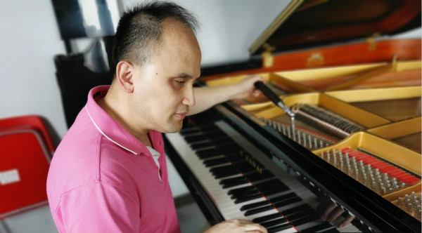 毕业于上海盲童学校的张振宇,是从学校的第一届钢琴调律职业技能培训专业毕业的。毕业后,他去过钢琴厂,也在琴行干过,还和一起学钢琴调律的同学们组建过电声乐队。2002年,张振宇和另5名盲人调律师开始创业,组建了一支自己的团队,为客户上门调律。2005年,他们成立了一个工作室,调律之余,又在客户的建议下开始销售二手钢琴,并培训调律师。