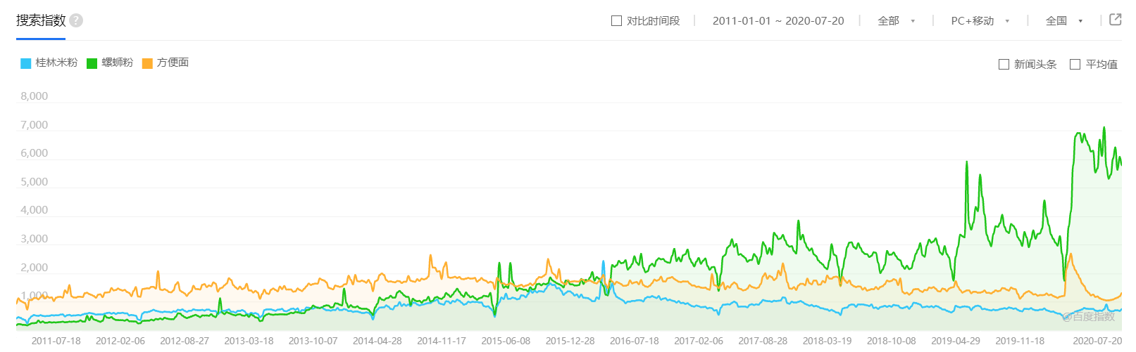这当然不是螺蛳粉风靡全国的主要原因。综合PC端和移动端的搜索数据,以“桂林米粉”和“方便面”作为参照,我们可以看到,2012年5月《舌尖上的中国》第一季播出后,“螺蛳粉”的百度搜索指数并未出现明显变化,而真正的爆发是在2016年中旬,“螺蛳粉”的搜索指数开始稳定地超过“桂林米粉”和“方便面”。