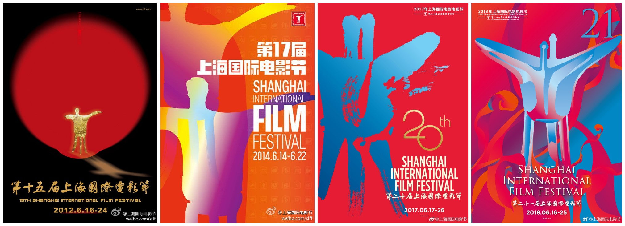 而此前,从第13届上影节开始至第21届上影节,官方海报的主视觉曾一度沉湎于金爵元素,制作出风格相近、元素相同的海报。