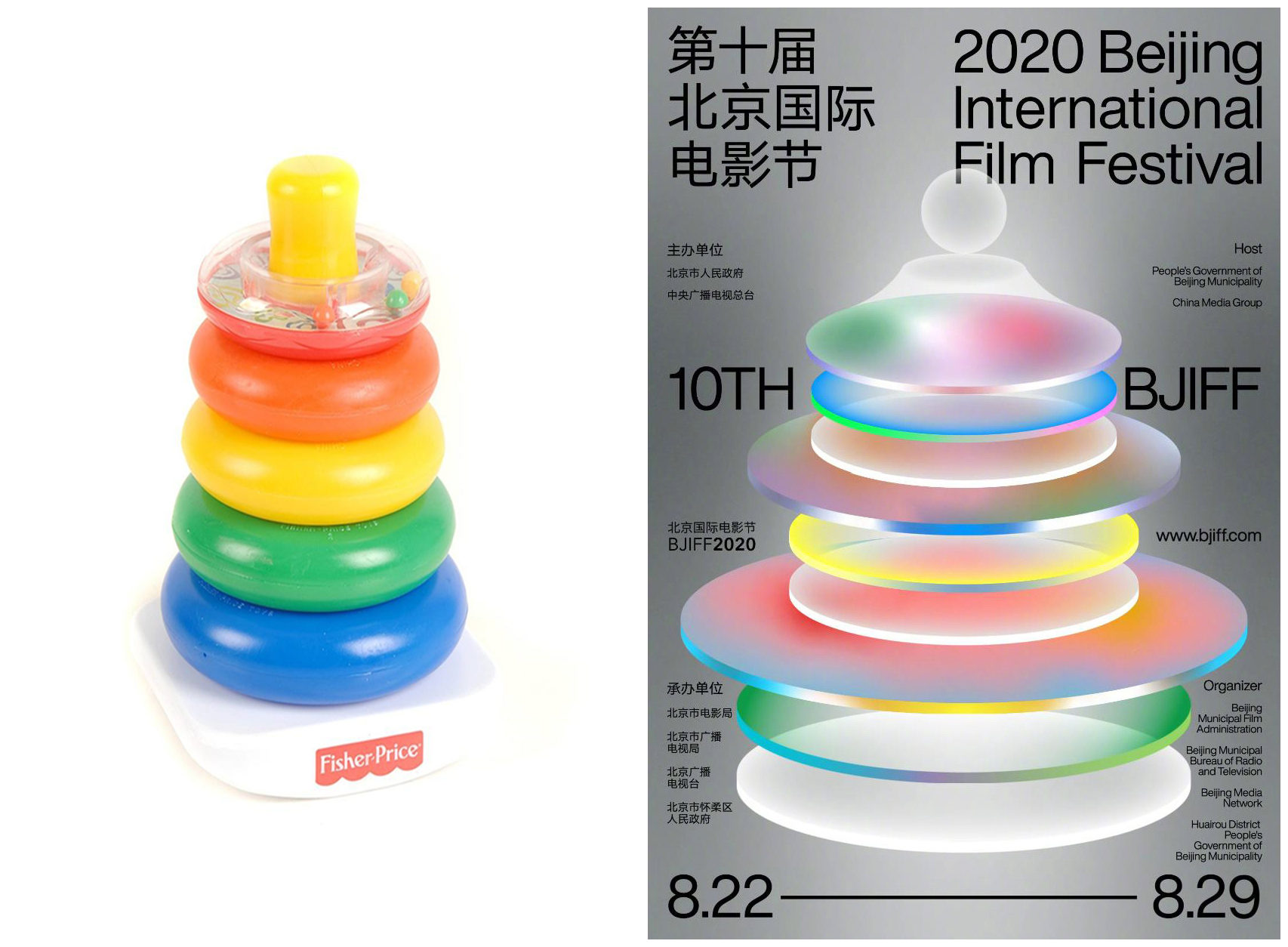 据传今年北影节海报由立入禁止工作室设计,这家工作室此前的海报作品,更像是在北京798艺术区看到的展览海报。然而,此次北影节海报的新尝试,并未能被大众接纳。有网友看到海报后,将幼儿玩具彩虹套圈与海报对比进行调侃。