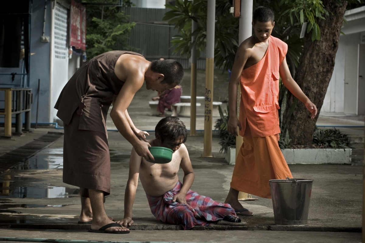 这是佛教寺院谭克拉布寺(Wat Thamkrabok),专门用作戒毒。这些红衣人正在戒毒瘾和酒瘾,其中三十多个本地人,十多个西方人。一个药物成瘾的爱尔兰人四肢着地,旁边一个冰毒成瘾的泰国少年不断发抖。寺庙里的草药师在他们的喉咙里灌进浓稠的棕色液体,他们顺从地吞下。背景音乐是康复中的病人敲打钹和手鼓的声音。
