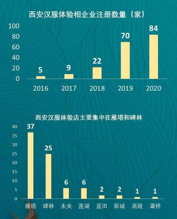 据汉服资讯计算,2019年全国汉服产业总产值达到45亿元,较2018年10.9亿的产值规模飙升逾3倍。而据西安本土研究智库西经club今年6月的一项报告,西安汉服体验产业崛起于2018年。目前工商数据中注册登记的84家汉服相关门店,全部都是个体户,近半成立于近一年中。